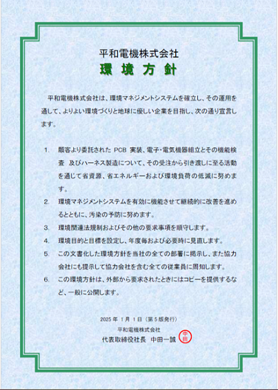 平和電機では受注から納品まで全てにおいて環境マネジメントシステムを確立し、省資源・省エネルギー・環境負荷の低減に努めるなど地球に優しい企業、そして持続可能な社会の構築に向けた環境経営に取り組んでいます。